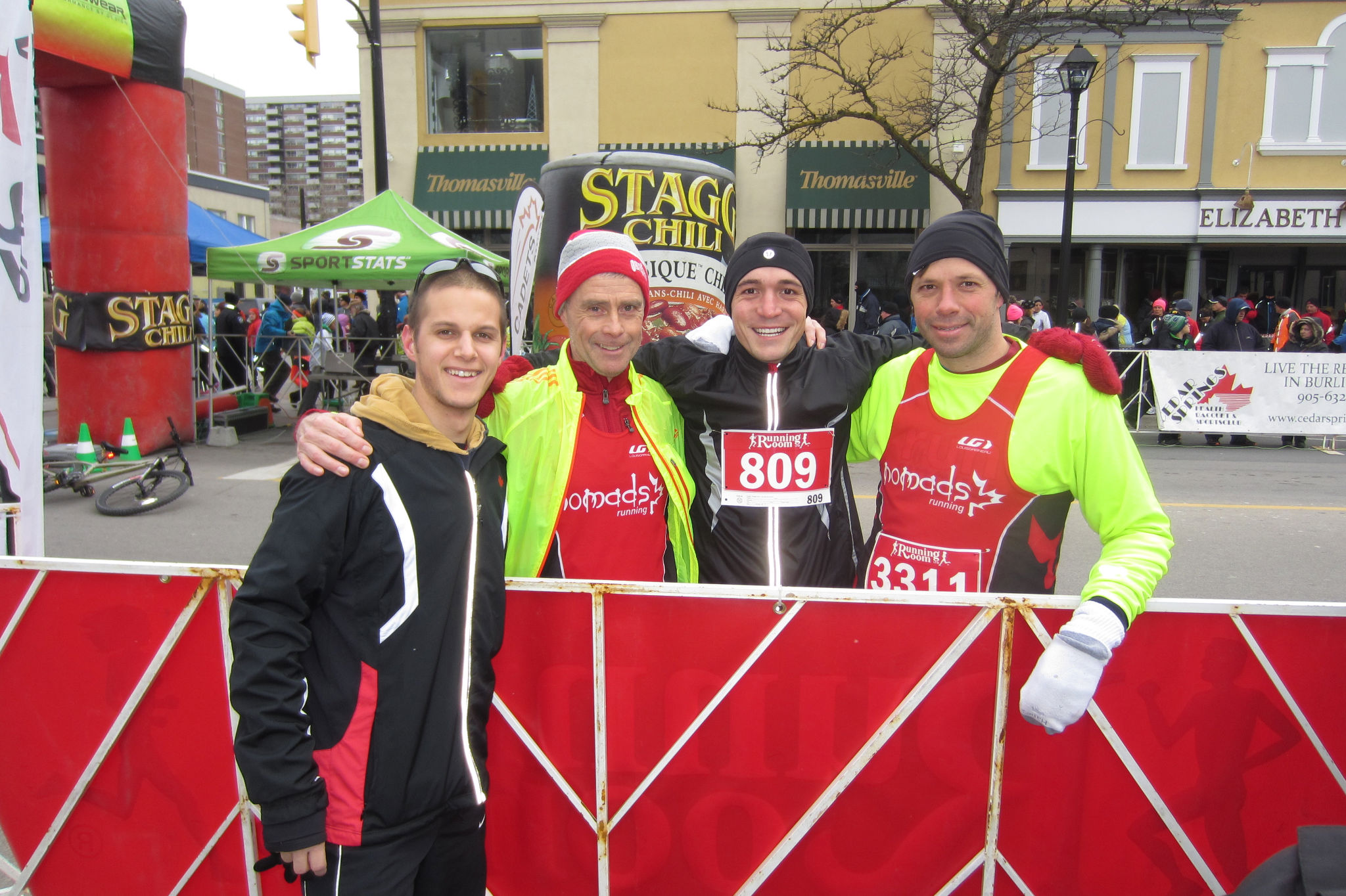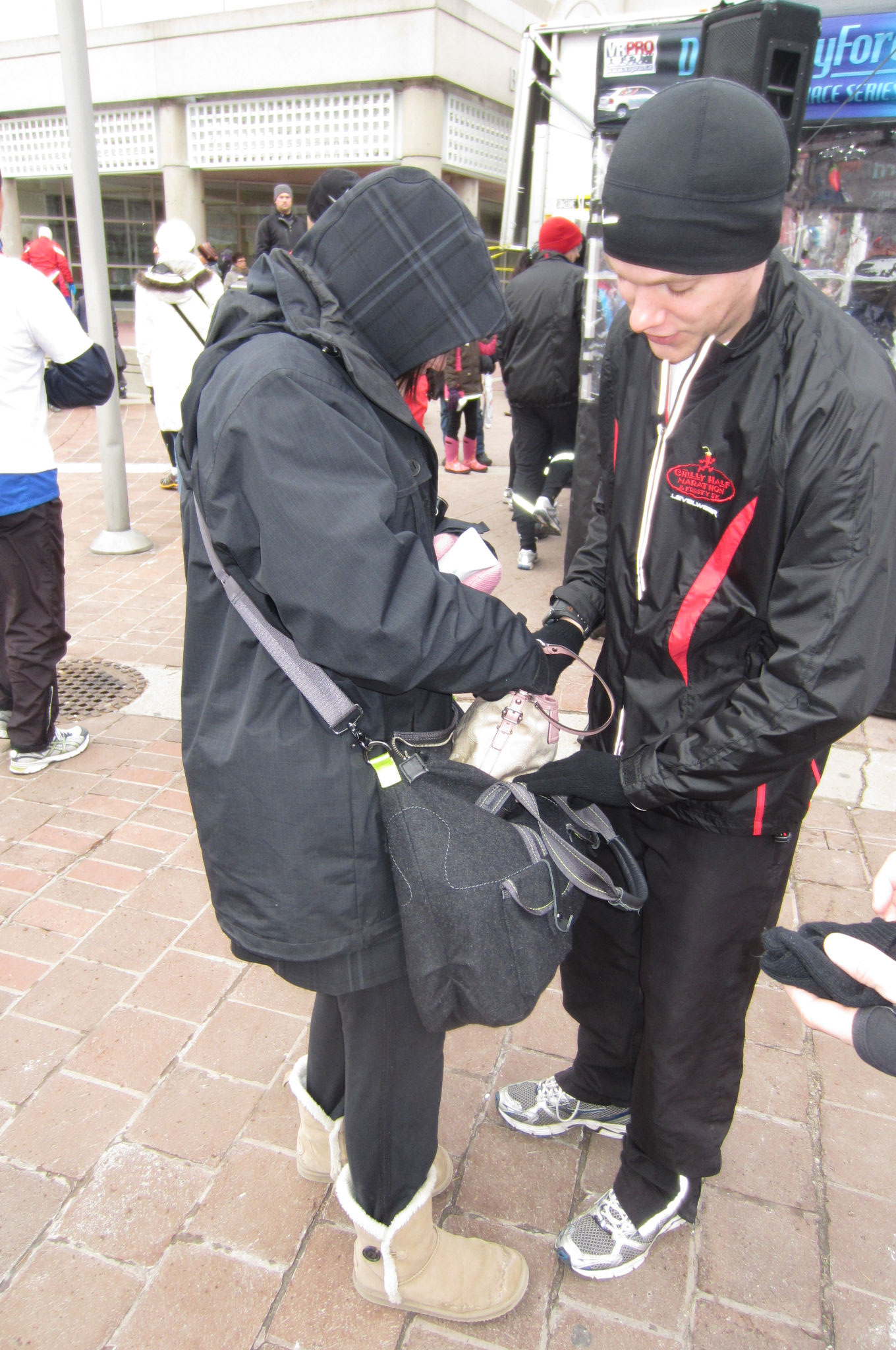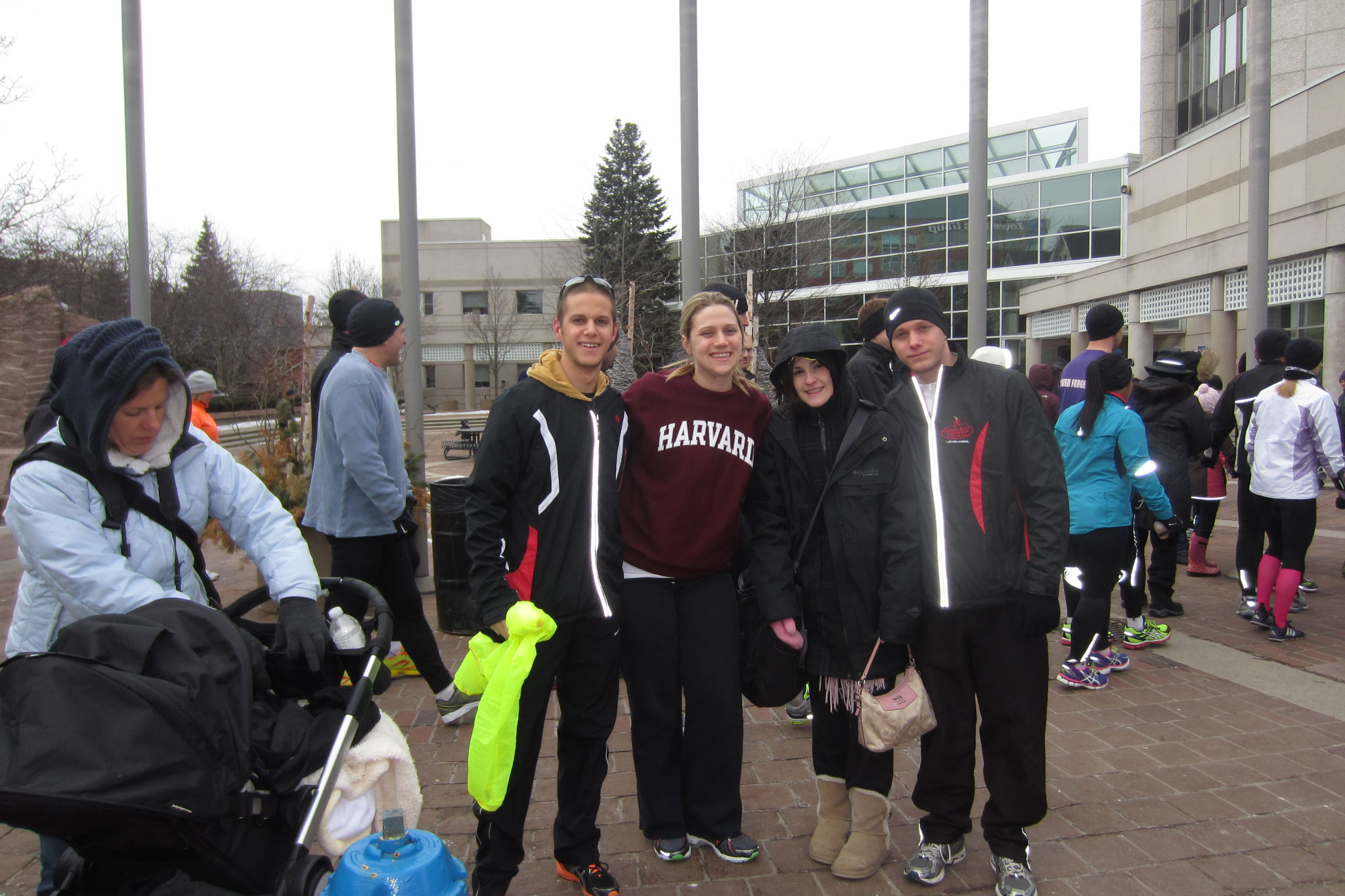 It was cold outside, about -6 degrees and just enough wind to bite. All four of us had kind of learned our lesson from our last race (the Eggnog Jog) where it was below -10 and we all FROZE our tails off waiting for the race to start. We dressed warmly this time, which meant way more cargo for poor Jess to cart around. Honestly, there should be a medal for spectators and race crew.