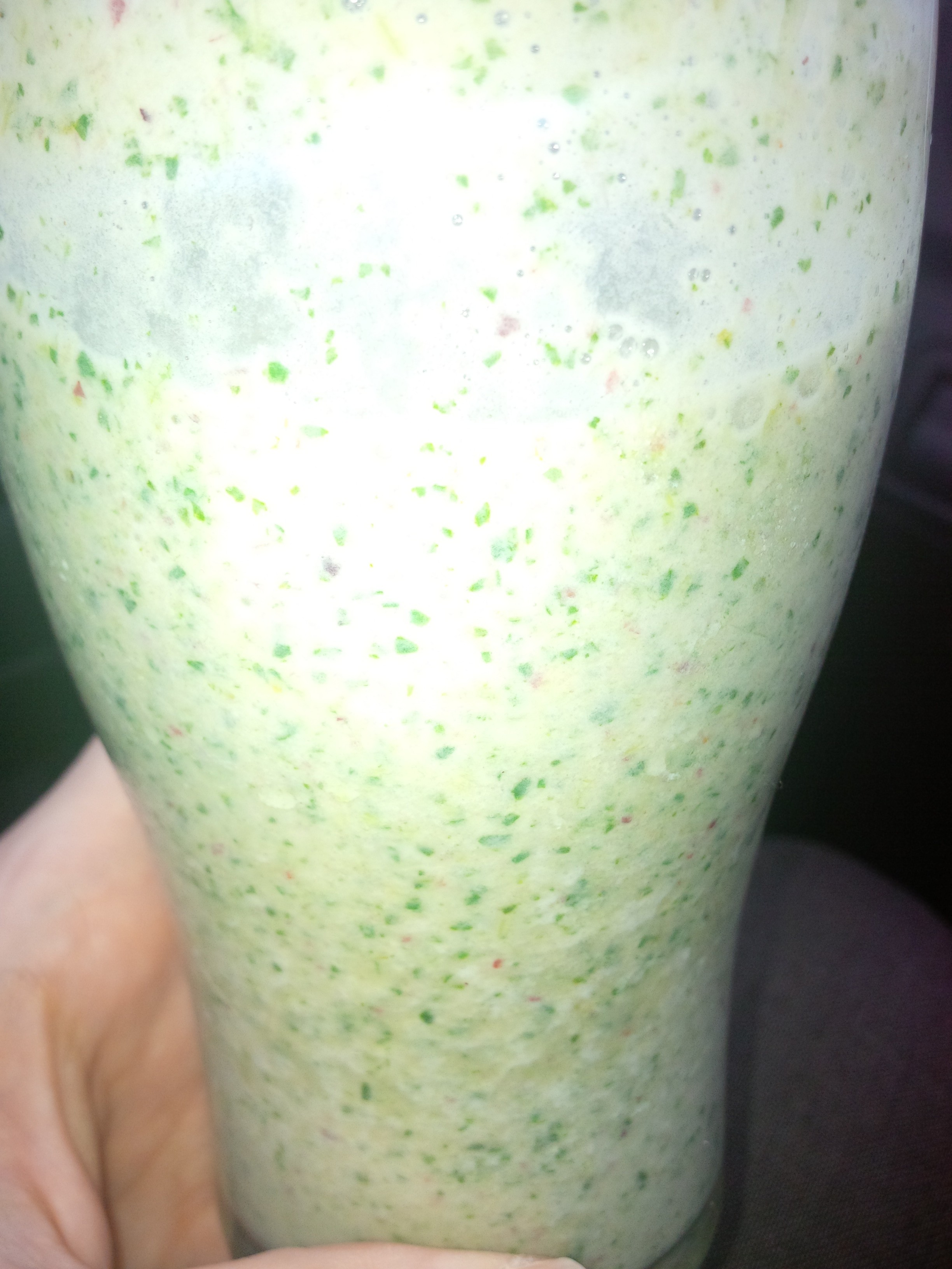 This morning at 7:15am I cheerfully tossed about 2 cups of the frozen Kale, a handful of the summer fresh fruit salad, that black banana and about 2 cups (or more) of milk into my blender and whirled ‘er away.