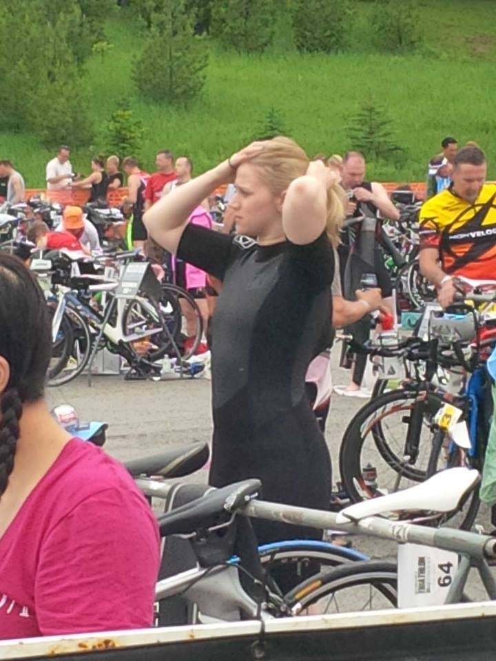 We got to Kelso well before the 8:30am cut off for entrance to the park and right away I was totally overwhelmed and confused! There’s a lot of logistics when it comes to triathlons! First of all, nobody ever explained to me exactly how you “rack” a bike. I nonchalantly kind of looked around at what everyone else had done, and kind of slid Jilly up onto the rack somehow and by some grace of God she actually stayed put, but I counted myself lucky on that one! We got permanently tattooed – I mean , body marked with our numbers and our ages and by the time all of that stuff was taken care of, the Try a Tri race was beginning and we watched the swim set off.