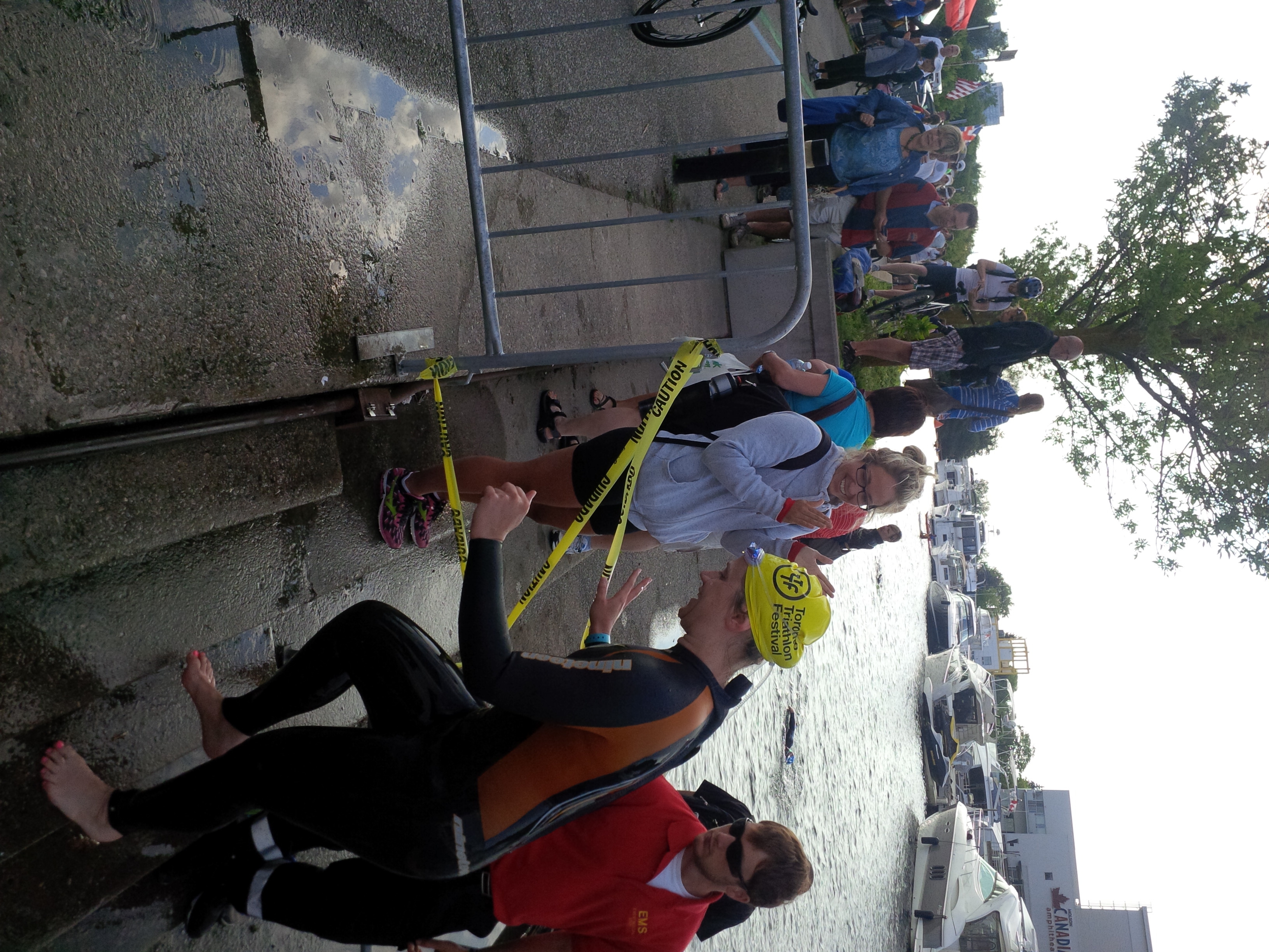 Matt and my friend Mariane (who was signed up to do the Sprint distance race later that morning) were standing right there about one foot away from me when I came out of the water (you can actually see Mariane in the picture above, she’s the one clapping her hands in the gray sweater!).