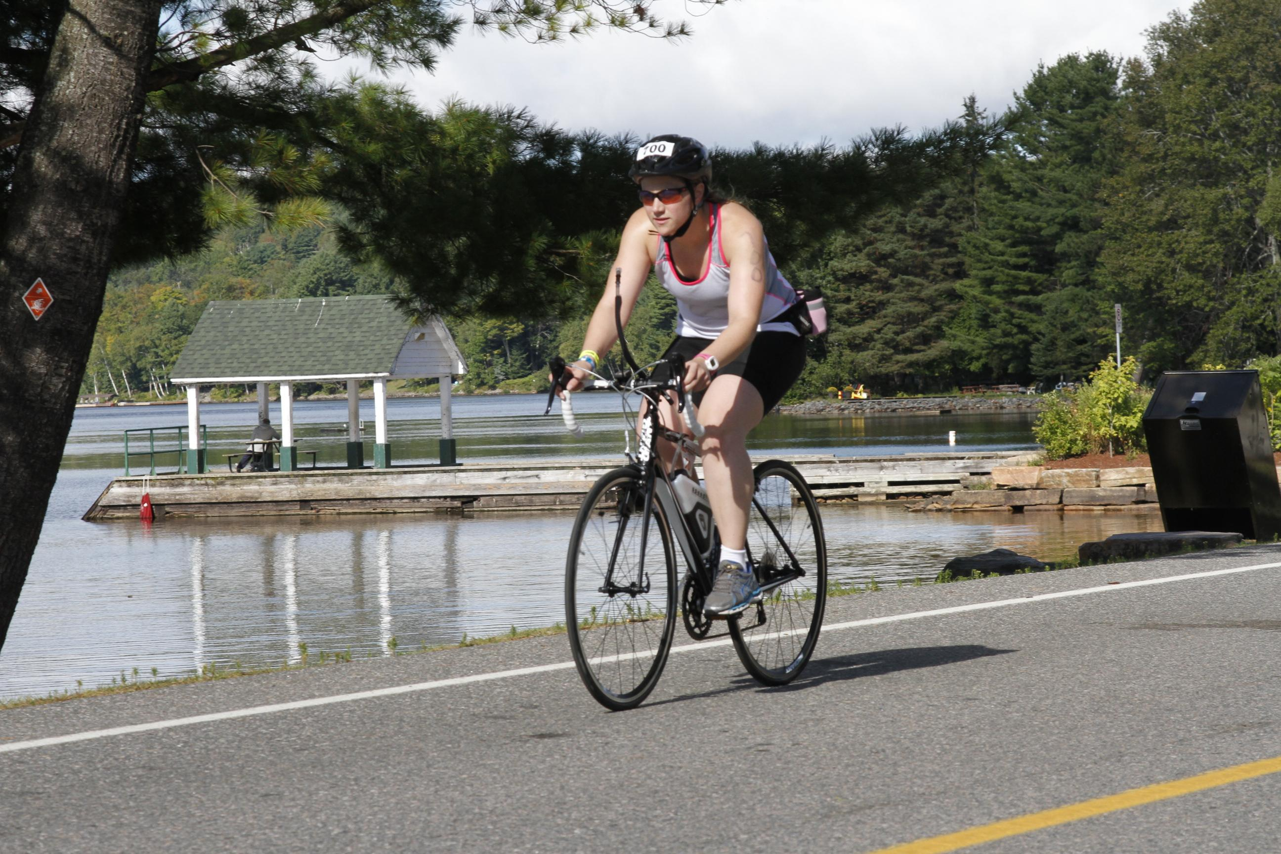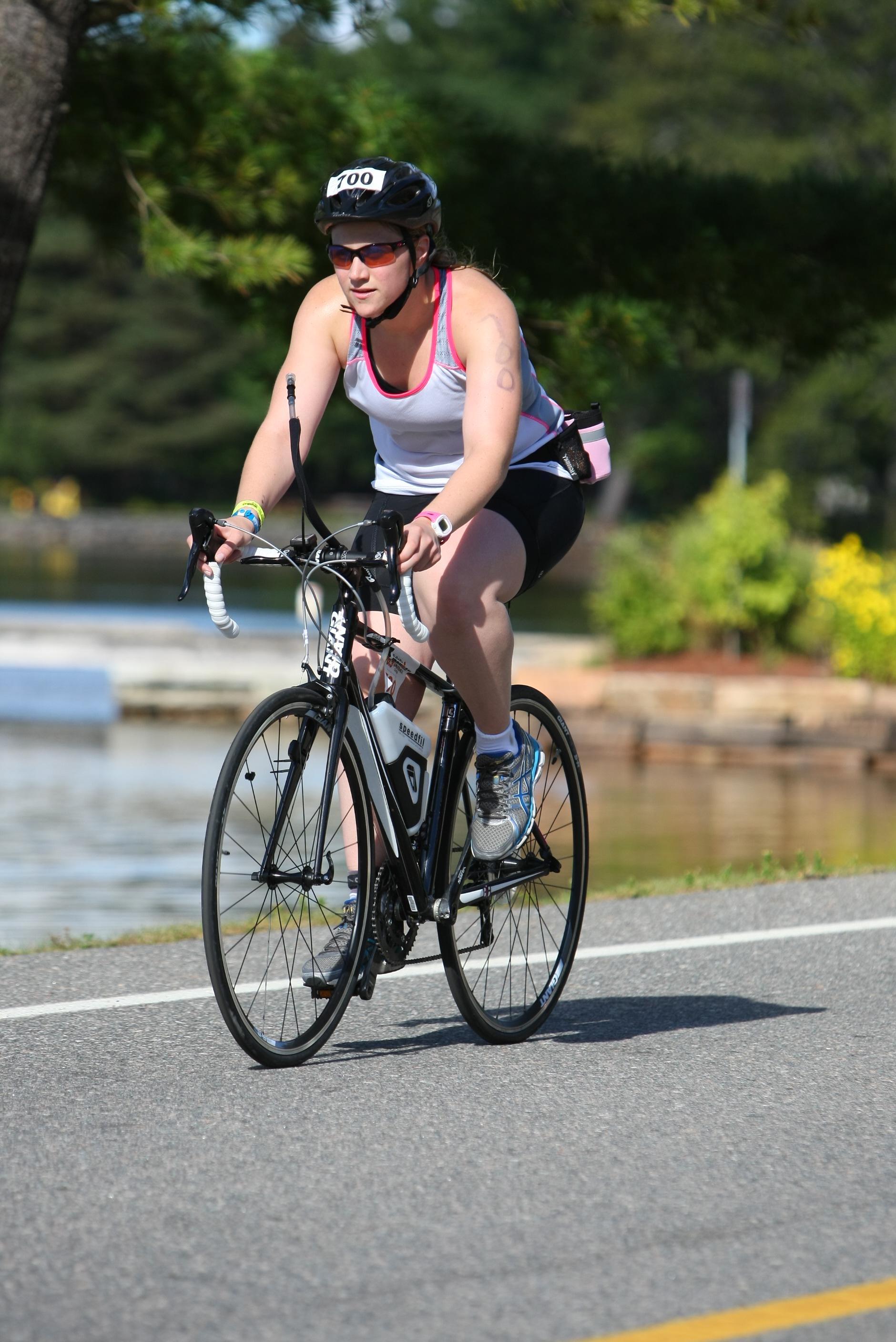The water was warm and flat, not even a ripple to negotiate. The sun was out and it was the most absolutely beautiful, cool day; just perfect for a triathlon. The swim was totally uneventful for me until towards the end. I noticed that although I was at the back of our wave start, I was still keeping pace with a bunch of men back there which made me feel pretty good! I’ve gotten so much better at getting my head up and looking where I’m going to avoid any direction disasters like the one I had in the Milton Triathlon and the buoys were spaced out perfectly so there were no issues there.