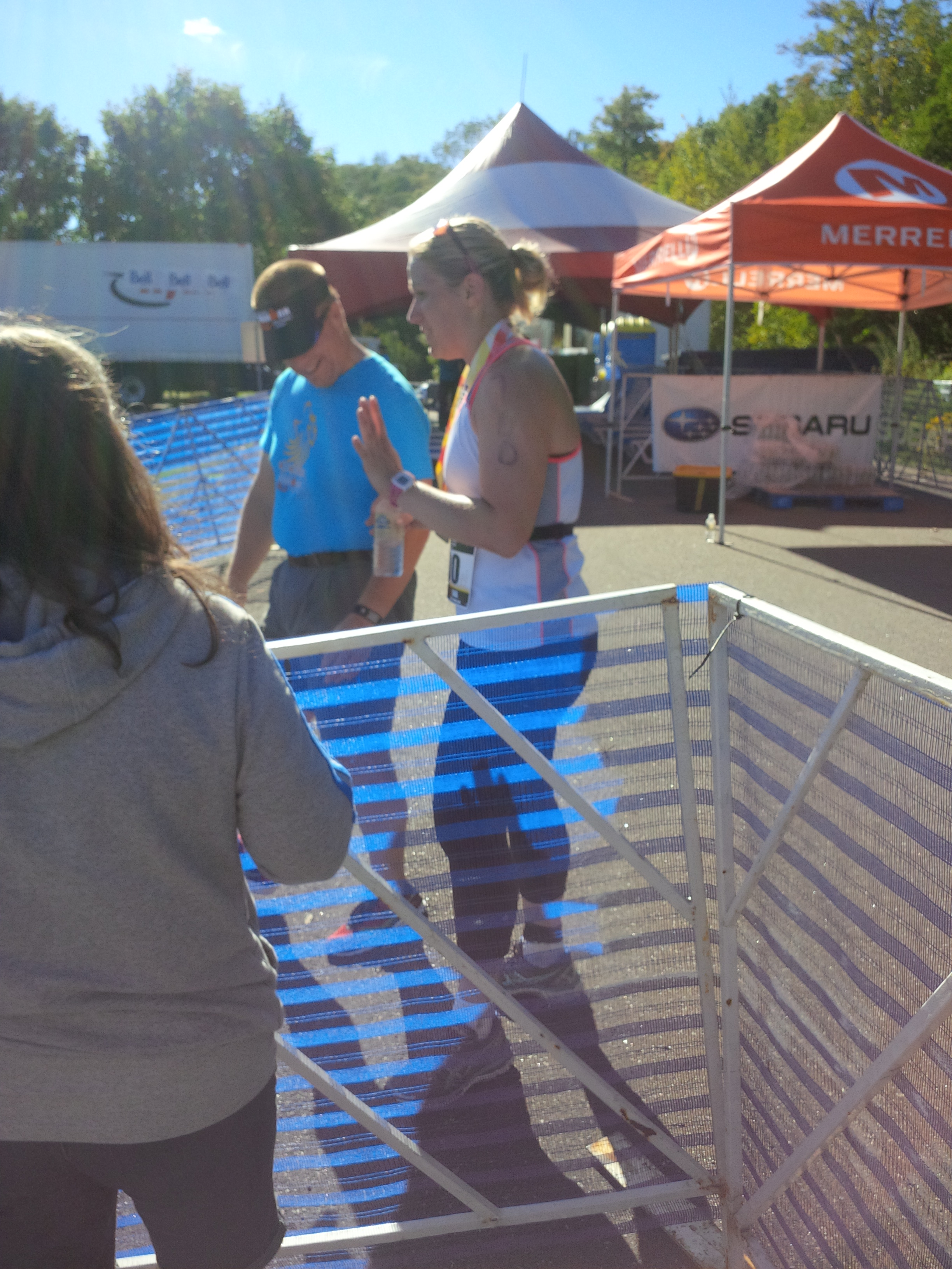 I racked Jilly back up, took off my helmet and started to think about getting changed into my running pants. There were about 4 guys (probably my age or a little younger) hanging out by the fence just on the other side of the chute, and they were calling out “HEY! HEY YOU! HEY YOU!” I ignored them for a bit, but when they kept calling out I finally lifted my head and asked them if they were talking to me, at which point they told me no, sorry, they were talking to the one guy’s girlfriend who was ignoring them on the other side of my rack.