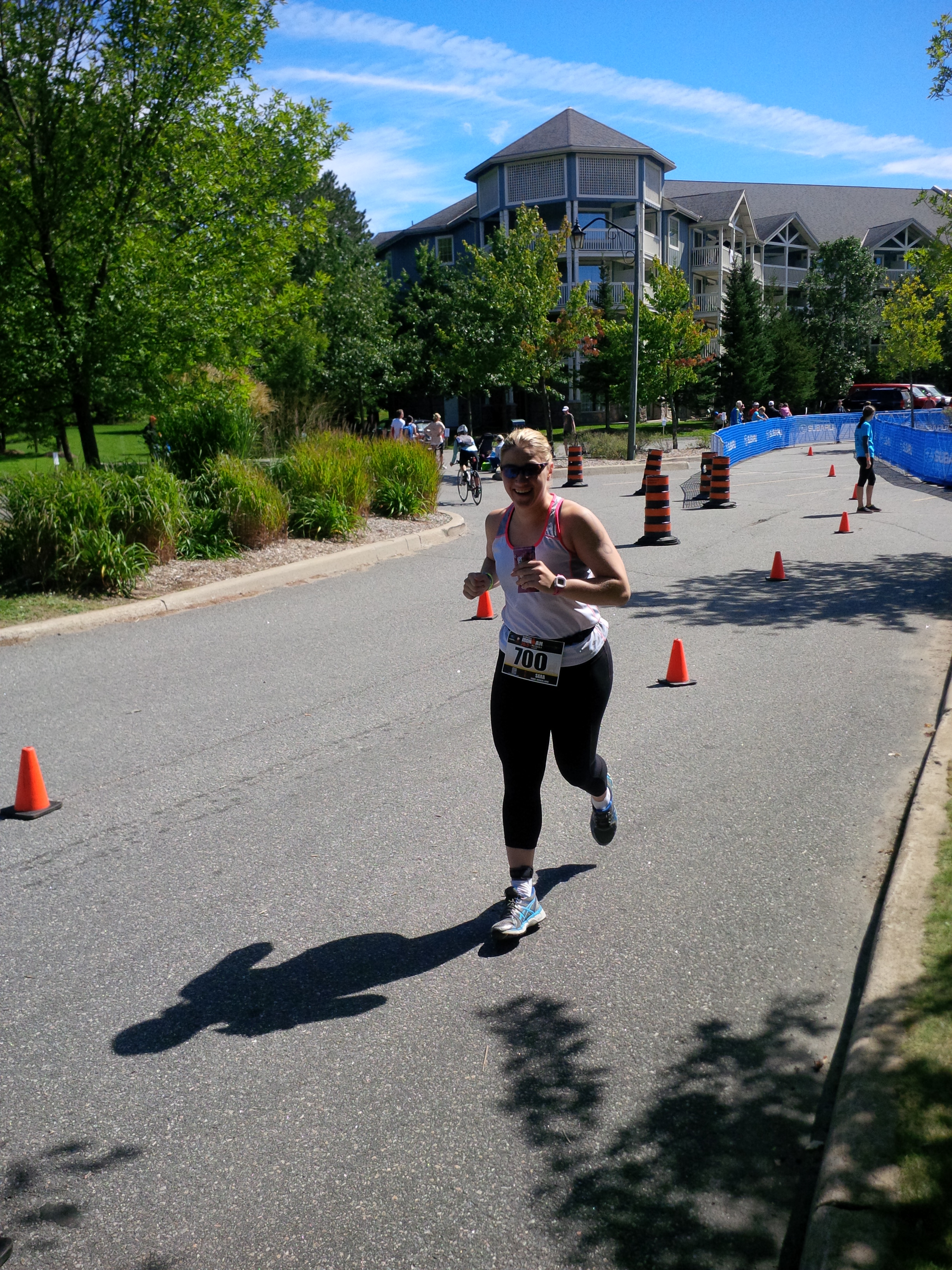 I was stopped at every aid station and taking a cup of Powerade and a cup of water from the volunteers. I also started to take some of the gummy snacks that they had as well, since I knew that I hadn’t eaten enough at the transition from the bike to the run. It was a beautiful, cool fall day in Muskoka on the day of the race, but on the run it started to feel a little bit hot and sunny.