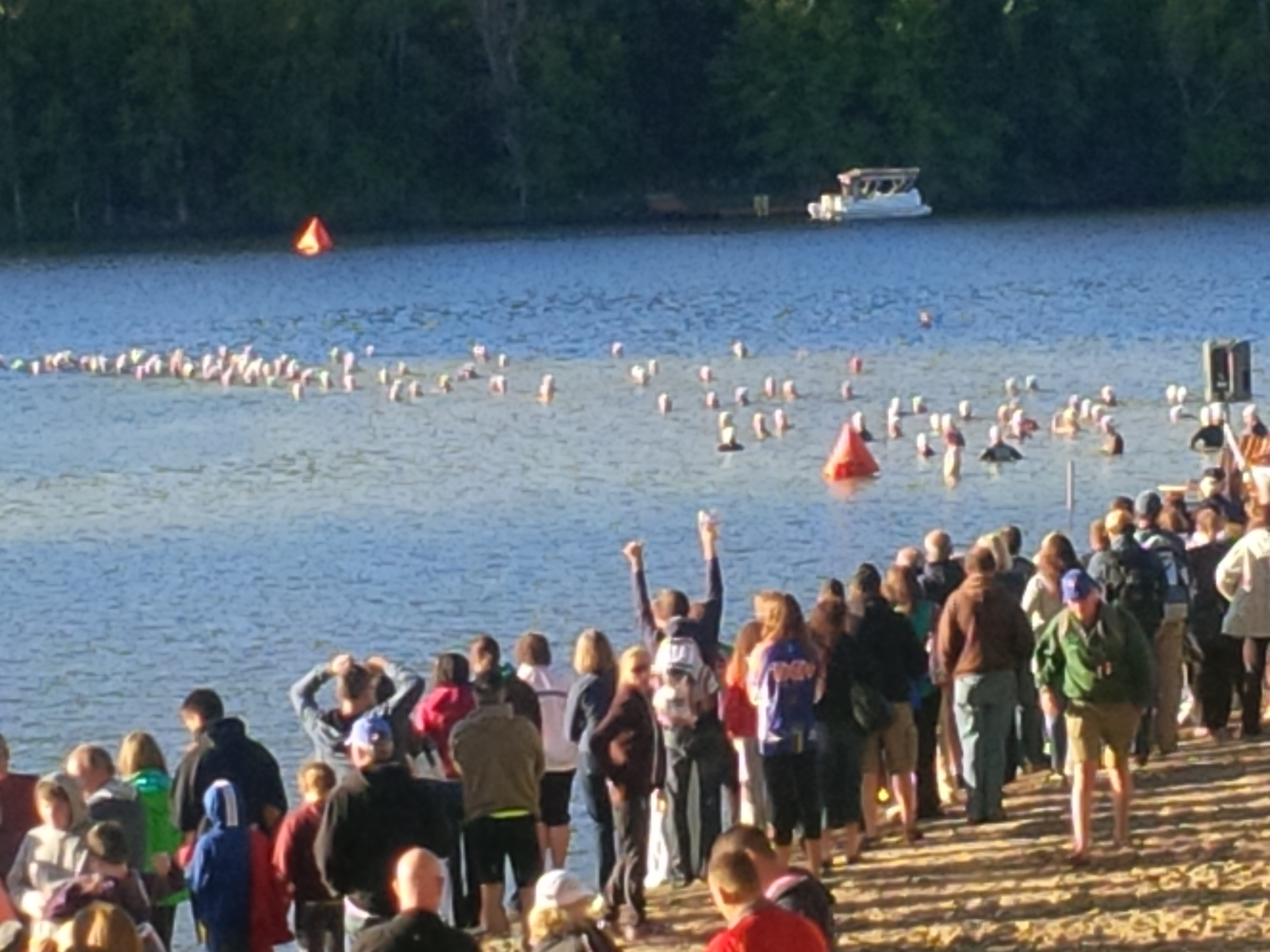 The walk-in start is soooooo much less stressful than a jump in start, I can’t even tell you. We got a chance to float around in the water, get acclimatized, go for a bit of a warm up swim, and just all around get the jitters out before we started off on the swim. Somehow, someway our little group of three nervous girls and Neil turned into a group of six nervous girls and Neil, so poor Neil took that opportunity to go and do a warm up swim. The rest of us stood around and chatted about the race, and what we were most nervous about. A really nice girl told me that her first year doing this race it had been her first Half IronMan, and she too had done it in her first year in the sport. She reassured me that she was out on the course for 8 and a half hours, and made the bike cutoff by 2 minutes, but she made it!